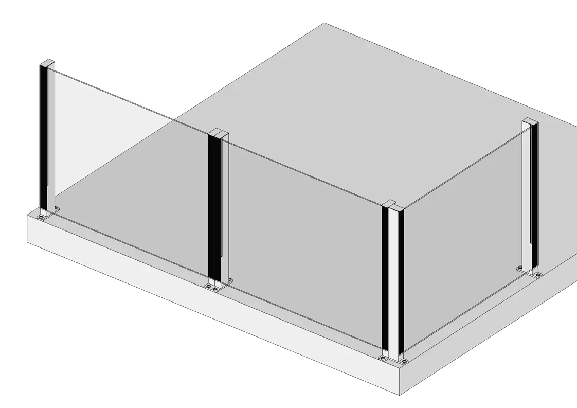 Lasikaide, jossa on listaton lasireuna kestävillä alumiinitolpilla. Käyttökohteena terassit ja parvekkeet.